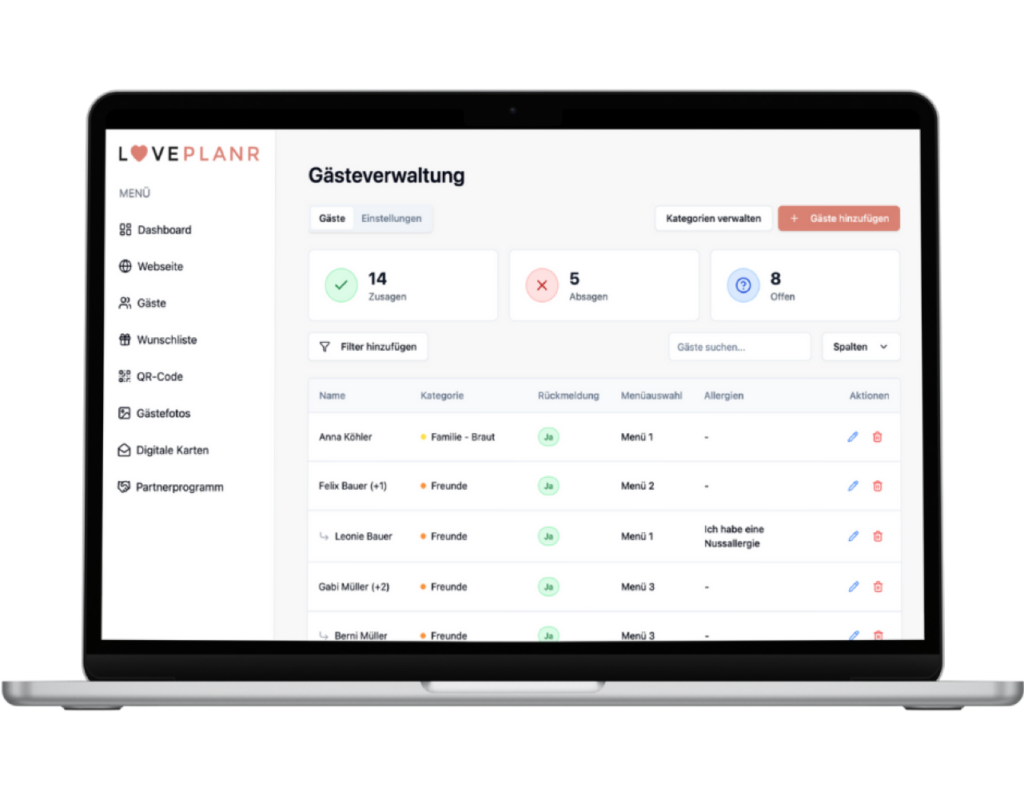Erstellt eure wunderschöne Hochzeitswebsite und verwaltet Gästerückmeldungen — stilvoll, übersichtlich und an einem Ort.