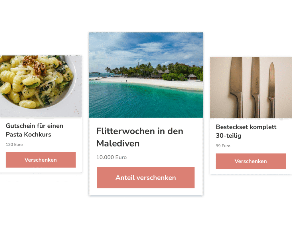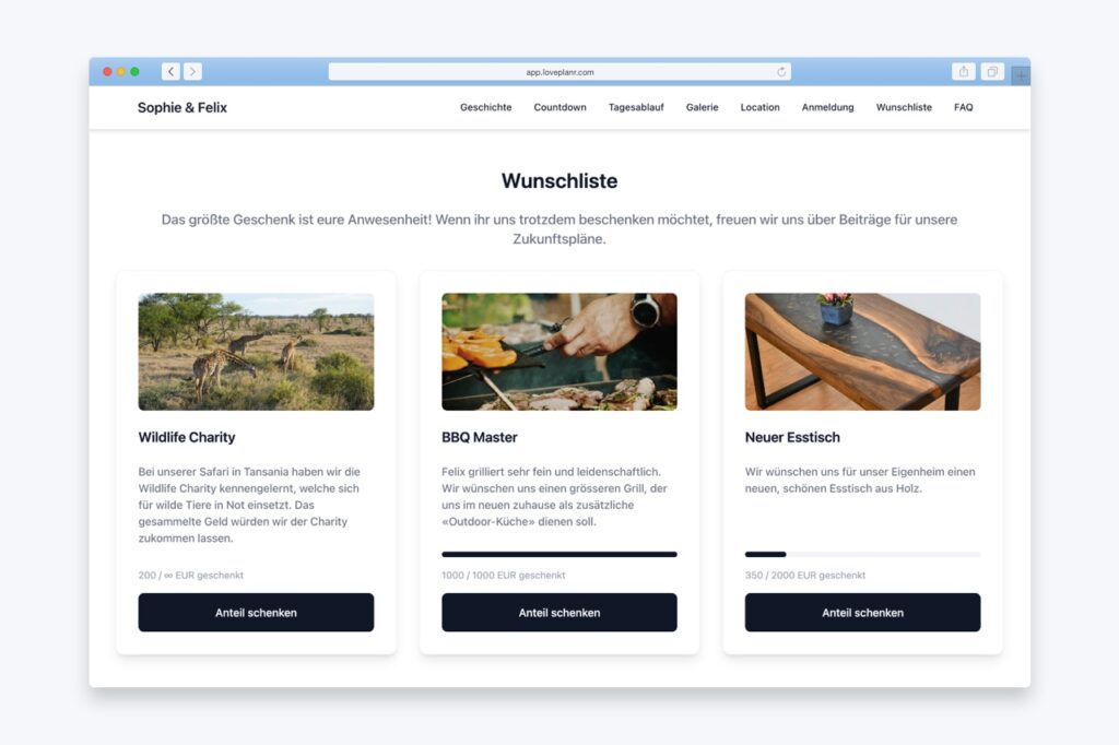 Das Erfüllen eurer Wünsche ist für eure Gäste einfach und intuitiv. Mit wenigen Klicks können sie auswählen, was euch am meisten Freude bereitet.