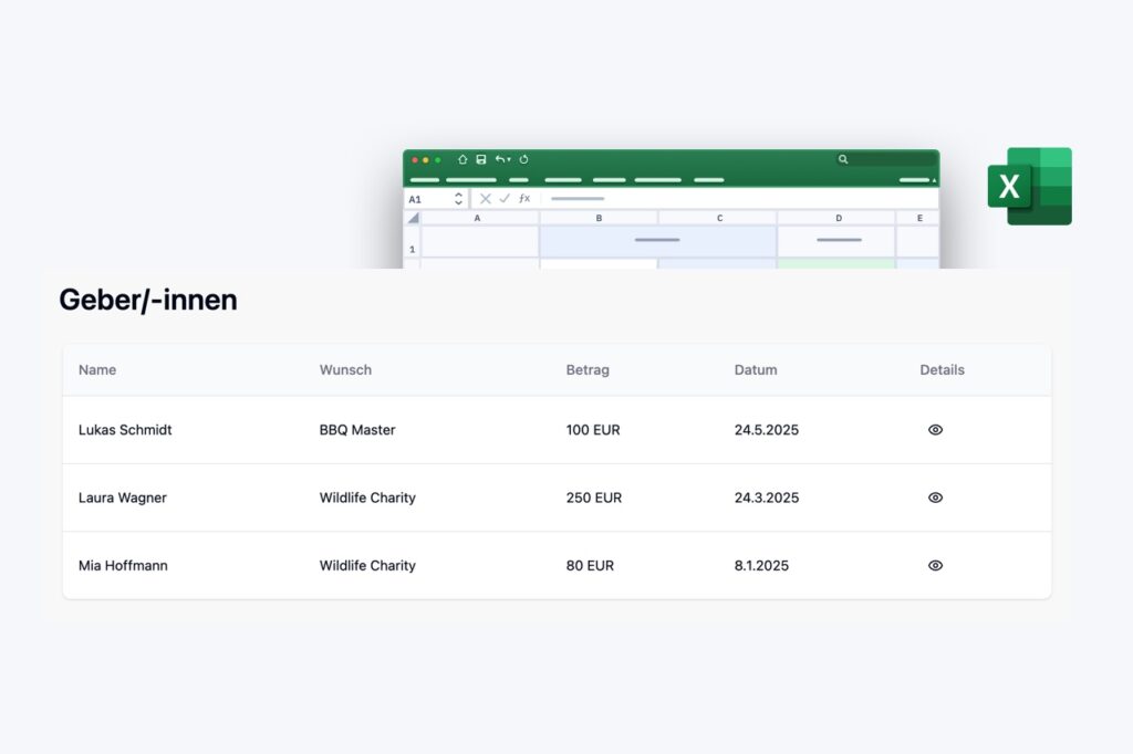 Im Admin-Bereich eurer Wunschliste habt ihr jederzeit Zugriff auf eine aktuelle Übersicht aller erfüllten Wünsche. Diese Liste könnt ihr bei Bedarf als Excel-Datei herunterladen und sie zum Beispiel nutzen, um persönliche Dankeskarten zu erstellen.