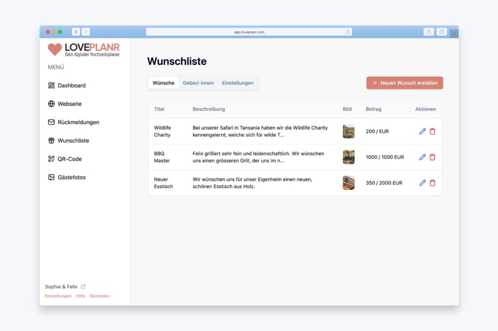 Loveplanr bietet euch nicht nur eine Wunschliste, sondern auch Hochzeitswebseiten, digitale Karten, Gästefotos und vieles mehr – alles nahtlos in einem Tool vereint.
