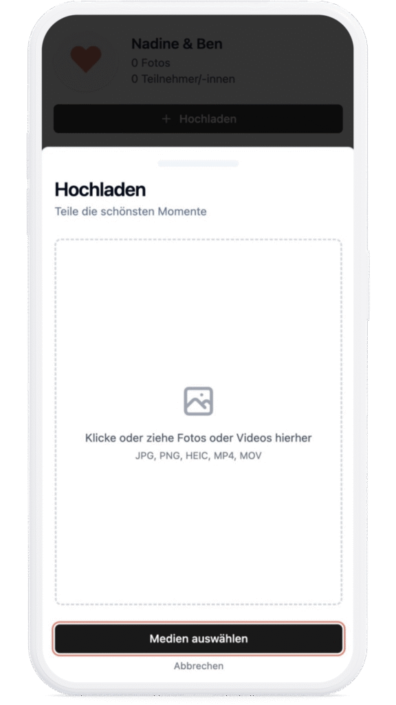 Ihr habt die Möglichkeit auch eigene Bilder der Galerie hinzuzufügen. Wechselt dazu in den Bereich «Hochladen». Von hier aus könnt ihr eine ganz einfach eine grosse Bildmenge (beispielsweise von eurer Fotografin) hinzufügen.