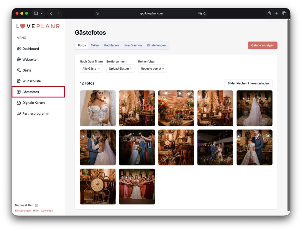 Mit der Loveplanr Fotogalerie sammelt ihr alle Hochzeitsfotos und Videos eurer Gäste an einem Ort. In diesem Artikel zeigen wir euch, wie ihr die Galerie verwenden könnt.