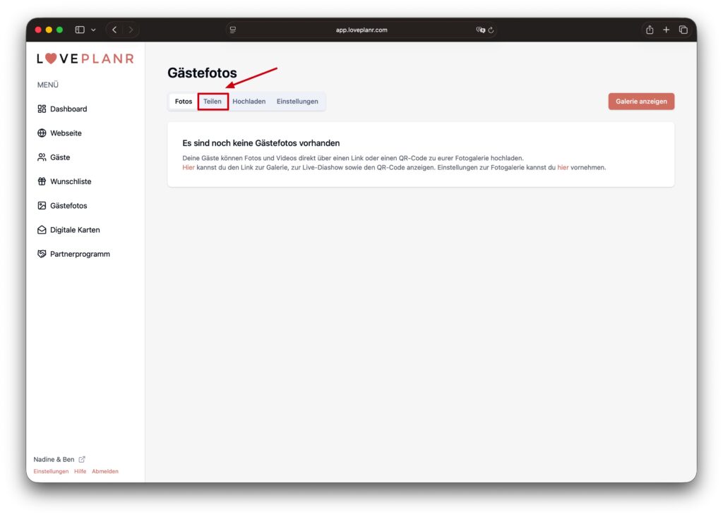 Um die Galerie mit euren Gästen zu teilen, wechselt in den Bereich «Teilen». Dort habt ihr die Möglichkeit, die Galerie per Link oder per QR-Code zu teilen.