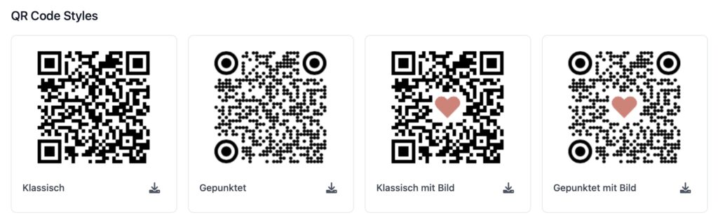 Ein QR-Code ist praktisch und kann einfach mit der Smartphone-Kamera gescannt werden. Hierzu stellen wir 4 verschiedene Stile zur Verfügung.