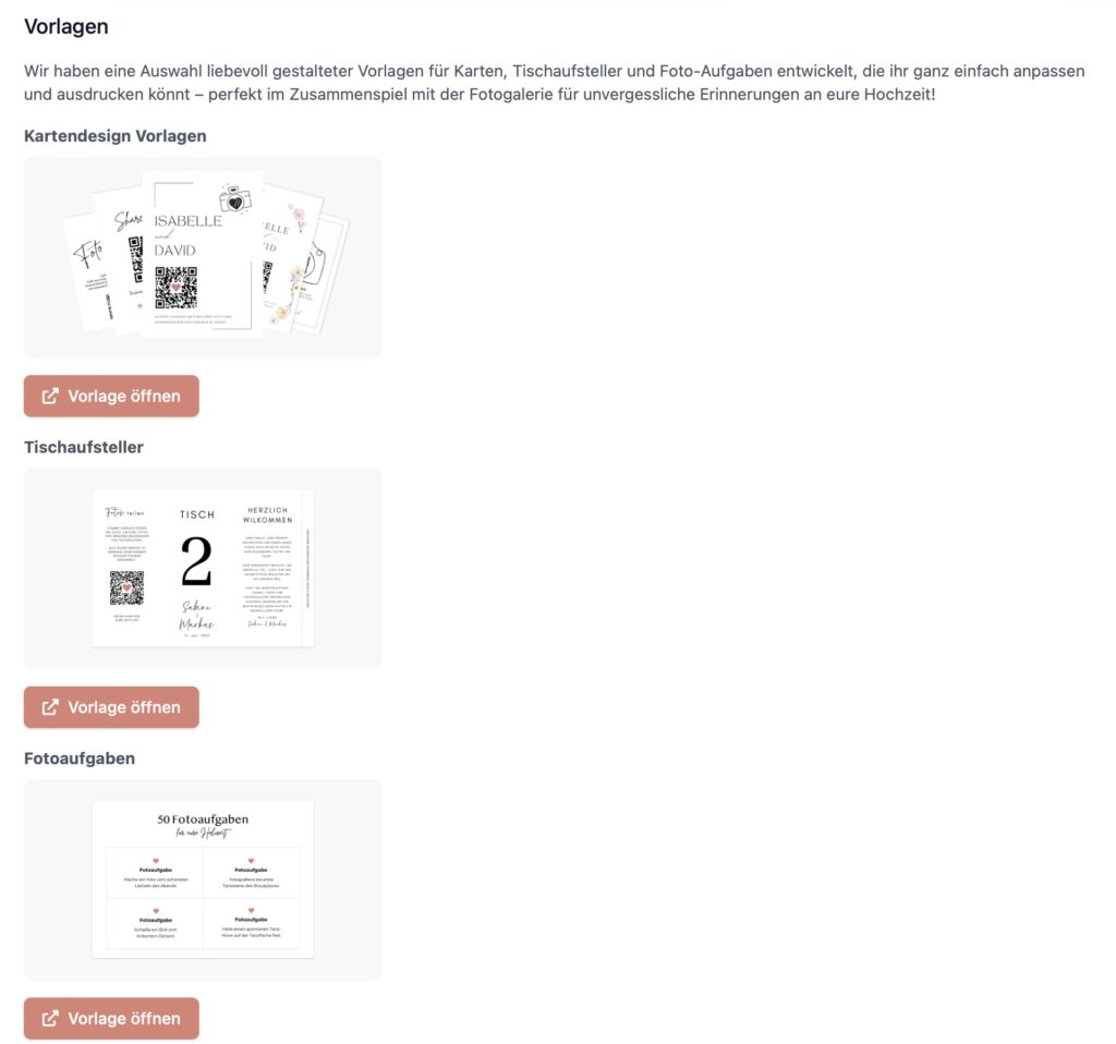Weiter habt ihr die Möglichkeit von unseren Vorlagen zu profitieren. So kann zwischen verschiedenen Kartendesign Vorlagen und mehr ausgewählt werden. Dies kann eine tolle Möglichkeit sein, den QR-Code zu eurer Galerie den Hochzeitsgästen zugänglich zu machen.