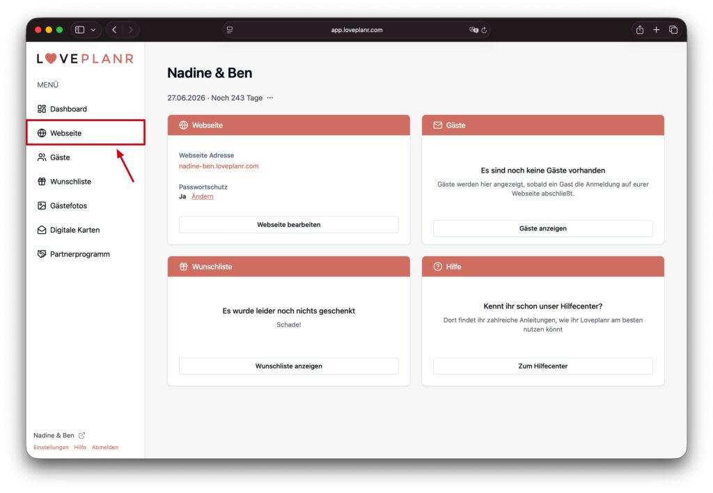 Damit die Gäste eure Wünsche erfüllten könnt, muss als erster Schritt das Wunschlisten-Modul auf der Webseite aktiviert werden. Dazu klicken wir auf die Schaltfläche «Webseite».