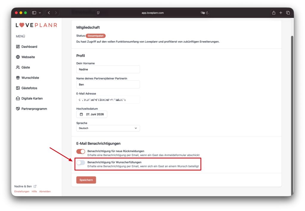 Deaktiviert dort im Bereich E-Mail Benachrichtigungen die Option «Benachrichtigung für Wunscherfüllungen» und klickt auf Speichern.