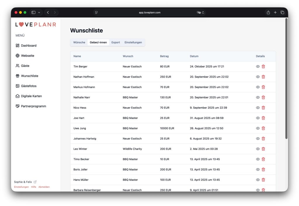 Solltet ihr einen Wunsch löschen, für welchen ihr bereits Geldbeträge erhalten habt, so ist dies möglich. Der Wunsch wird entfernt, aber die schenkende Person bleibt in der «Geber/-innen» Übersicht erhalten.