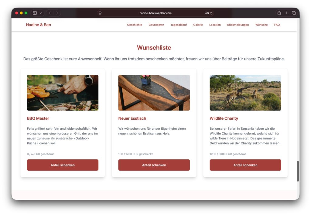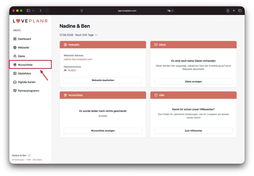 Mit der Hochzeitswunschliste sammelt ihr all eure Herzenswünsche an einem Ort. In diesem Artikel zeigen wir euch, wie ihr diese auf eurer Hochzeitswebseite einrichten könnt.