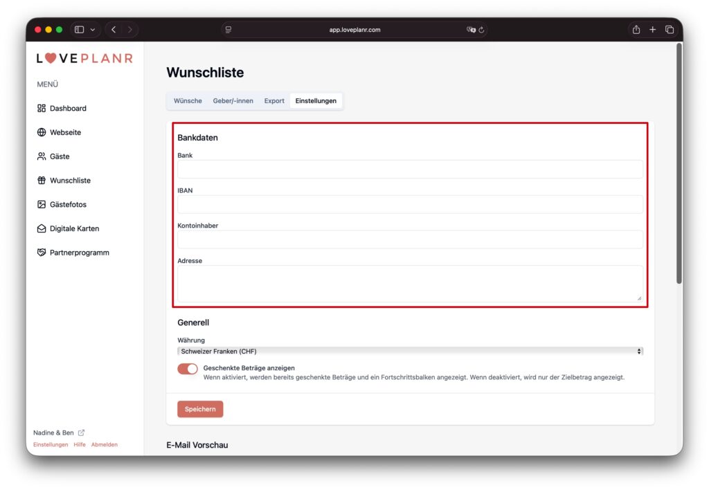 Im Bereich «E-Mail Vorschau» seht ihr, wie die E-Mail für die schenkenden Gäste aussehen wird.