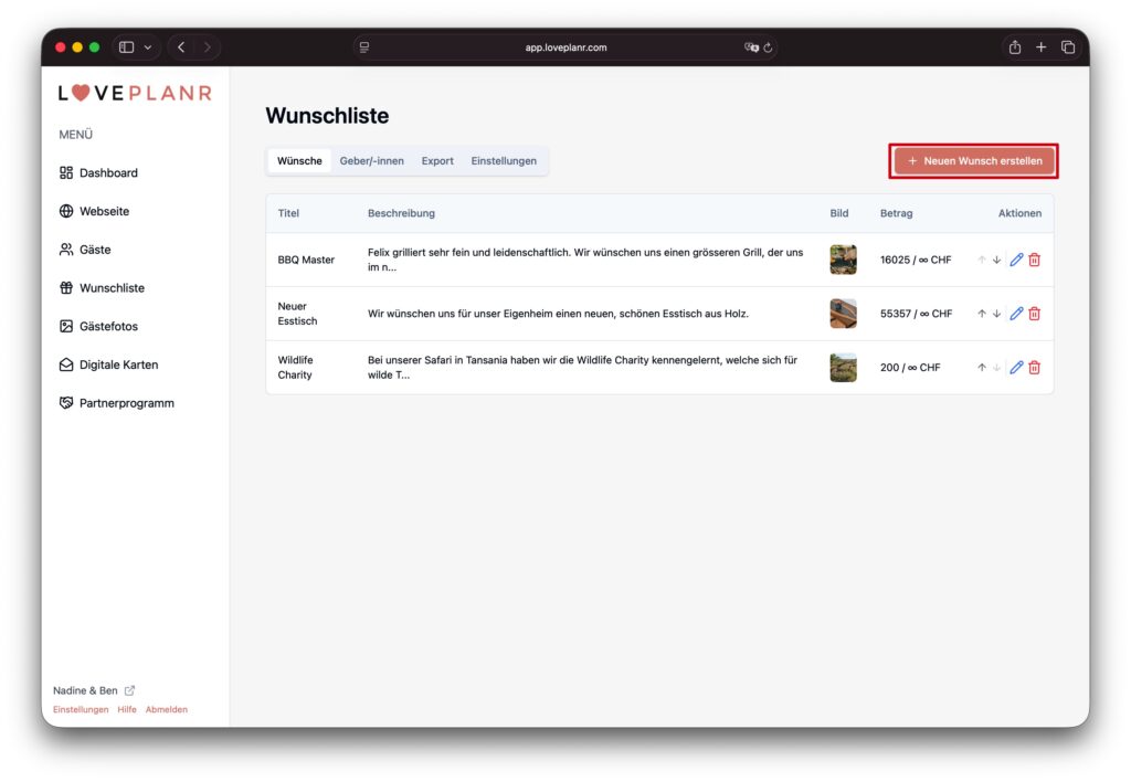 Erstellt euren ersten Wunsch, indem ihr auf die Schaltfläche «Neuen Wunsch erstellen» klickt.